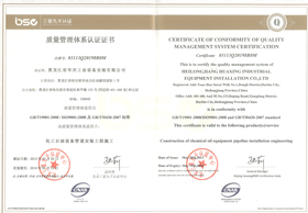体系认证工作,于2009年6月份获得北京九千认证中心的认证证书。质量体系覆盖范围为化工石油安装工程。